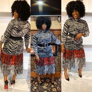Long sleeve dress with a high neck. Featuring a seam on the hem with contrast ruffled fabric. Fastening in the back with zip hidden in the seam.