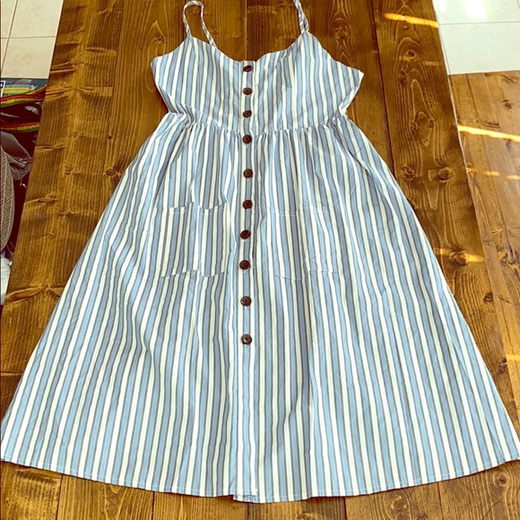 Lightweight, summer dress, two front pockets, spaghetti straps, buttons all the way down. Never worn.