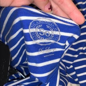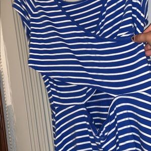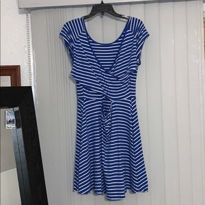 White and blue dress with a cross crossed open back. Worn frequently but it’s in good condition only thing is the wording is rubbing off on the tag as shown in picture