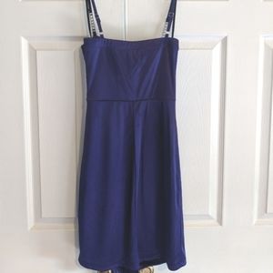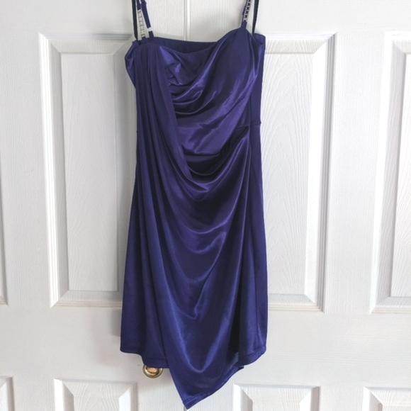 Purple satin dress Diamond accent on straps Length hits right above knee Asymmetrical design