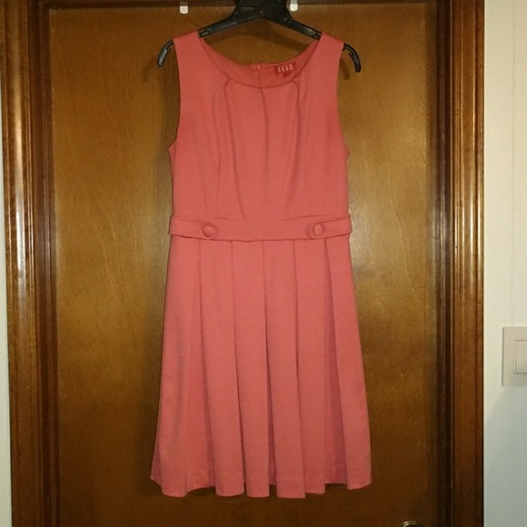 Adorable dress with button detail and pleats at the waist. Full skirt. Peachy orange.
