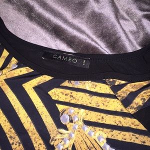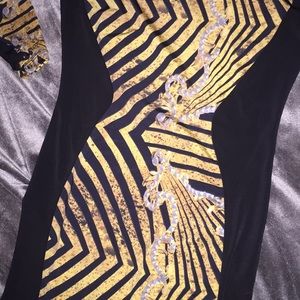 Black and gold vertical chevron printed bandage dress with gold chain and diamond design. The size tag isn’t attached anymore but I remember it was a small when I first purchased it. I wear size small in dresses