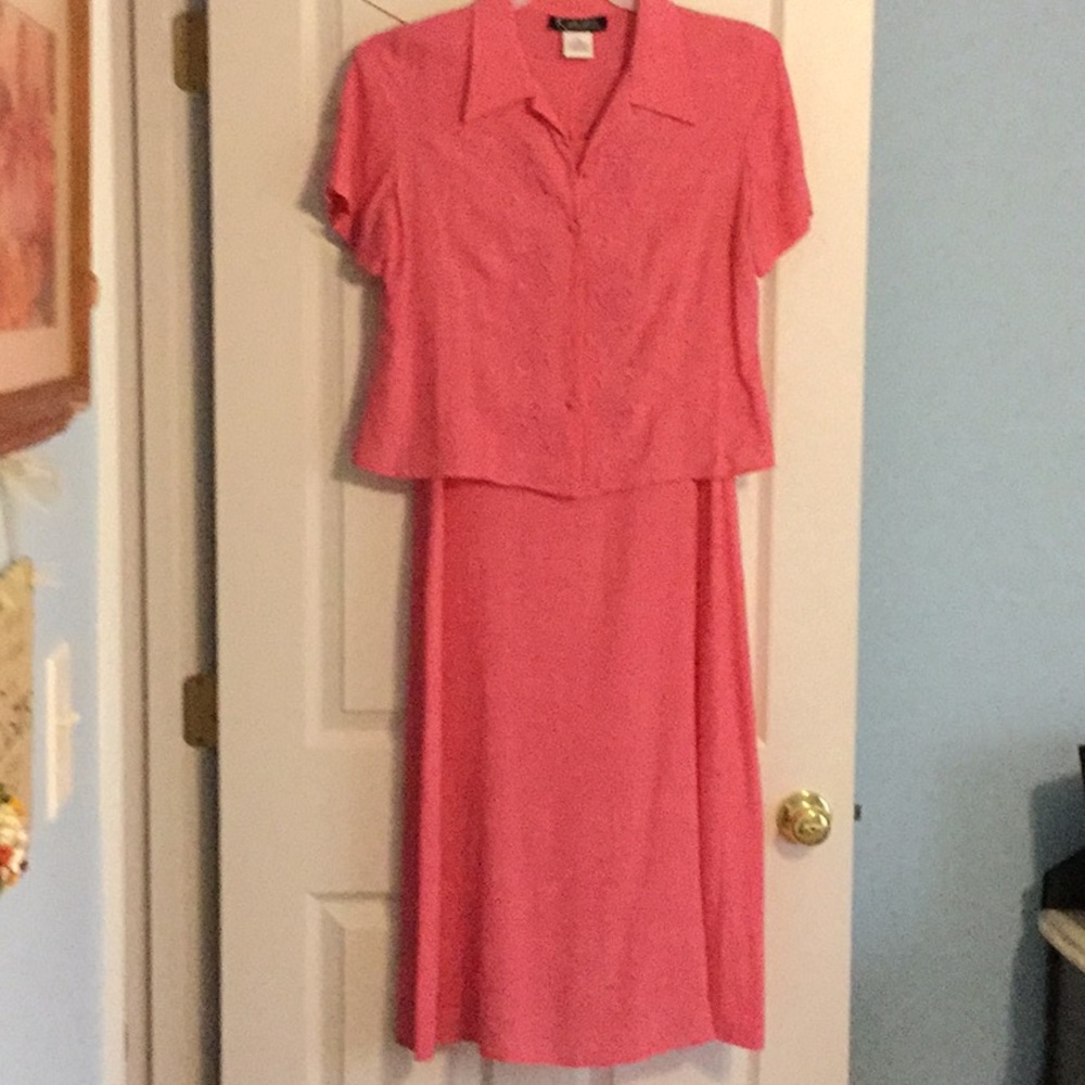 Delicate pink jacket dress. Dress is sleeveless with slightly fitted bodice. Beautiful pink”tone on tone” embroidery work on jacket. Jacket has slit opening in the back with cute button closure on bottom.