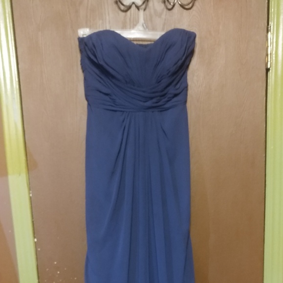 The dress is long. It zips in the back. It is sleeveless. The color is navy blue