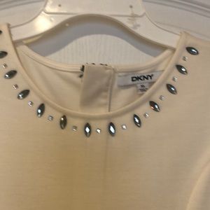 Euc. DKNY dress. Cream top with soft stretchy lace overlay. Lined bottom.