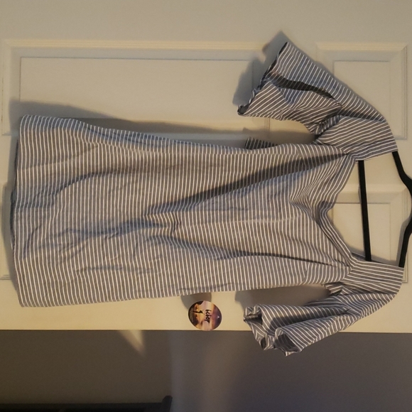 Off the shoulder denim stripped dress, ruffled sleeves, small slit on the back.
