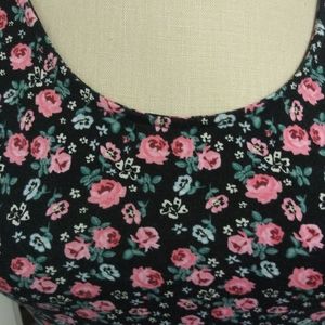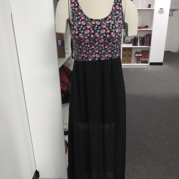 Black long dress with short sleeve and top of the dress has pink flowers. Also the bottom is translucent.