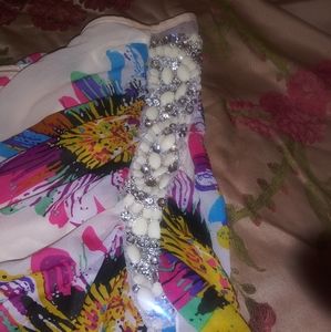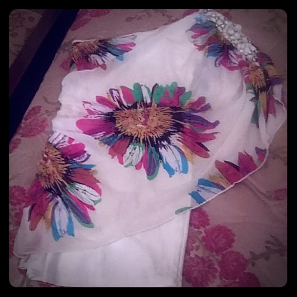 Mini floral 1 side sleeve dress with cape attached. The cream dress is a spandex/silk material. And the cape is sheer and see thru. With rhinestone and pearl decorations.