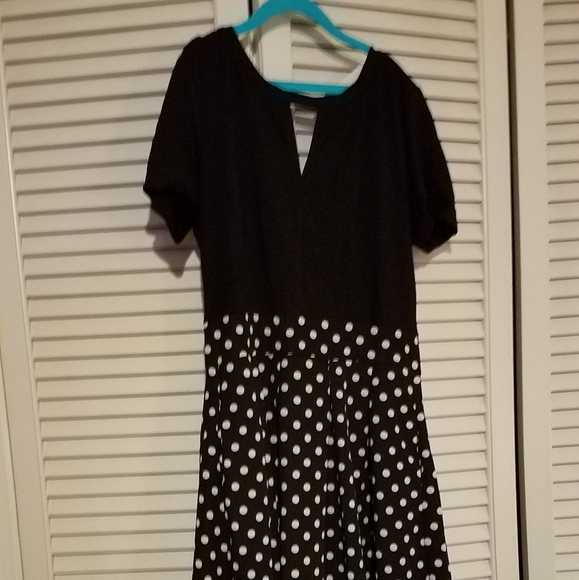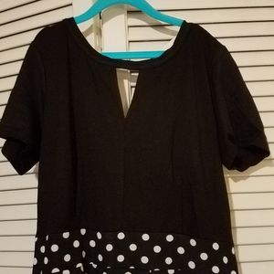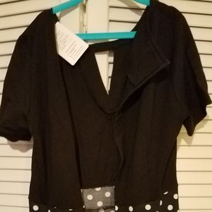 Black bodice with short sleeves, black with white polkadots flowing skirt