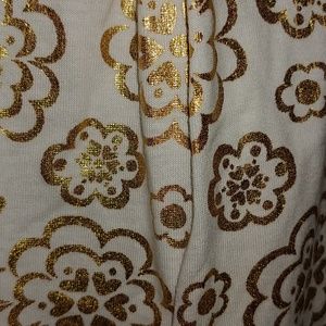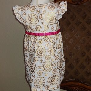 2 pc Gold, white and pink dress with a pink diaper cover. The dress has a dark pink ribbon going around the waist with a small bow. 100% cotton