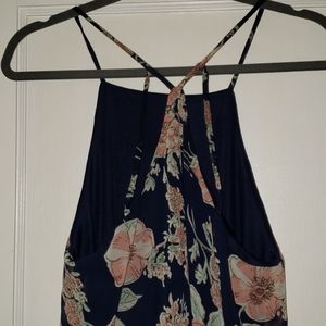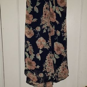 Peach royal size large but runs small. Black with flowers, lined. Outer fabric is shear and flowy. Just above knee length back a bit longer. Strappy detail in back. Worn once.