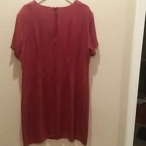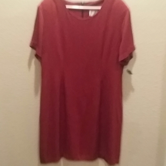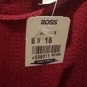 Red and Black pattern dress tuck pleats at waist front and back to give shape, knee length. Would look great with blazer over for work.