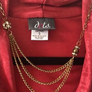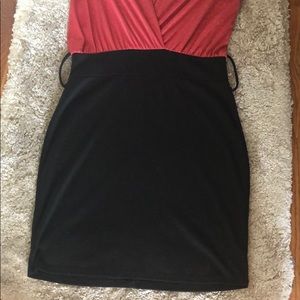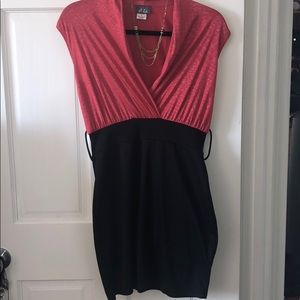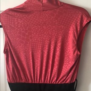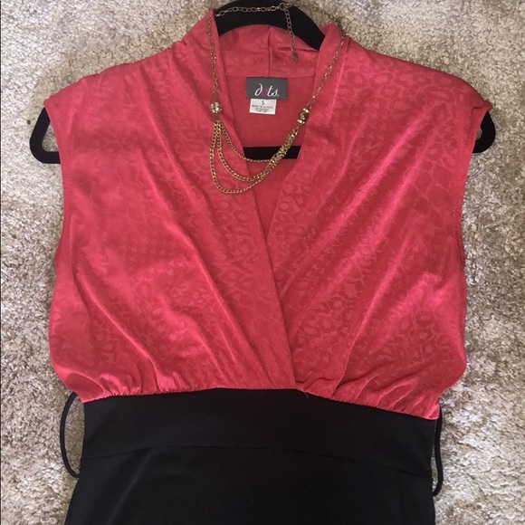 One piece dress. Top part is a leopard print in rose pink. The bottom part is attached and looks like a black skirt. There are two loops (can fit a waist belt about 3.5 inch wide), one on each side of the waist. Drapey v-neck.