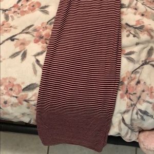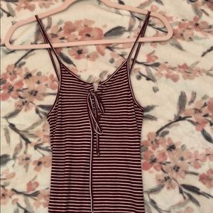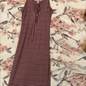 This is a stripped purple and white dress. Spaghetti straps. It fits snug.