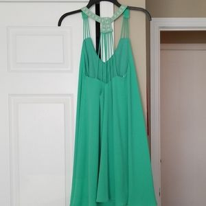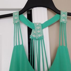 Green dress with straps and embroidery accent.
