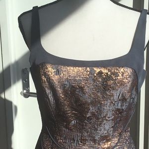 Gorgeous cocktail dress perfect for holiday parties and formal events. Multicolor abstract pattern with shiny gold tone accents. In pristine condition