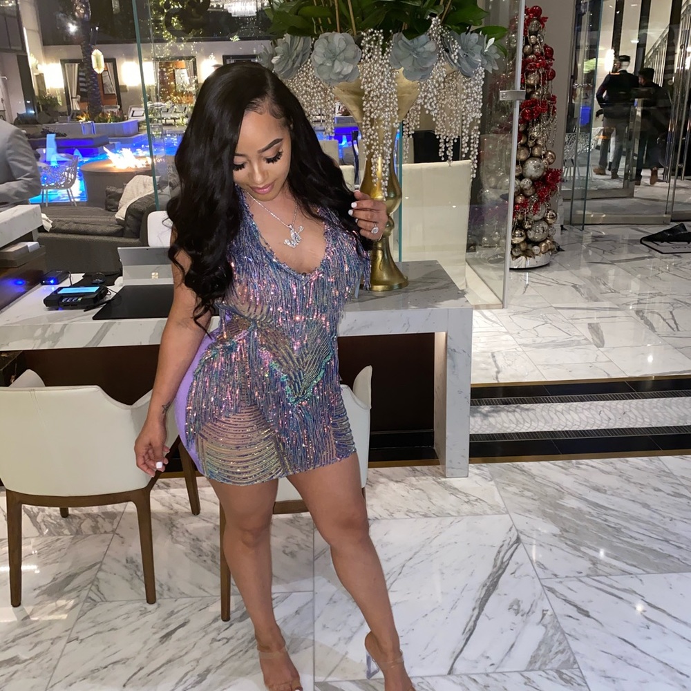 Custom dress that ties around neck . Size medium /large . The back is solid lavender spandex with the back out . Worn once . In good condition .