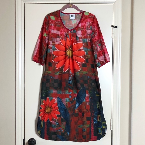 Very comfortable floral print dress made of 100% Polyester. Has pockets.