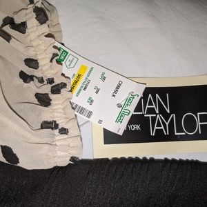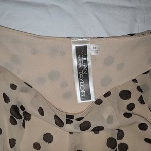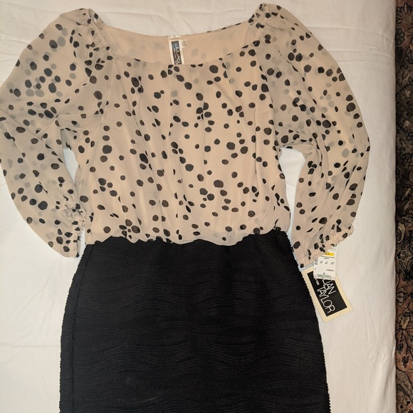 Brand new with tags!!! Size 10 Black and cream dress featuring a sheer blouson top half with polka dots and a cinched three-quarter sleeve. Flattering form fitting lower half with pretty ribbed design in the knit. Dress comes to just above knee. Perfect for office professional or functional for many other occasions.