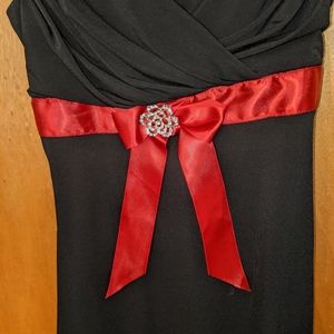 Black dress with red bow charm in the center.