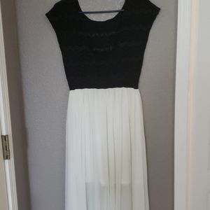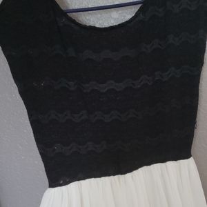 Black and white, top is stretchy and has a subtle pattern, the back dips significantly (back in photo), bottom is white and flowy. Only worn once.