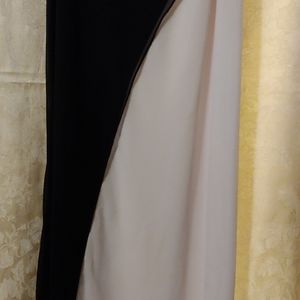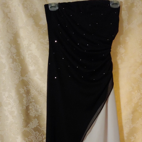 Vintage 2000s prom dress, sleeveless; black bodice with small decorative crystals, white skirt; asymmetrical design black over white; ruching to the L side; floor length; polyester; size 5/6