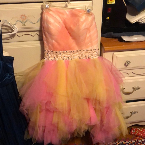 Short dress with coral top and pink and yellow tool, with beading around the waste and zipper back
