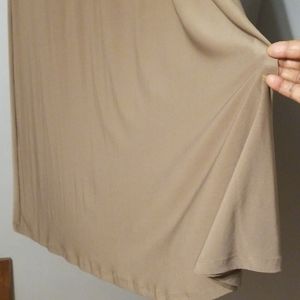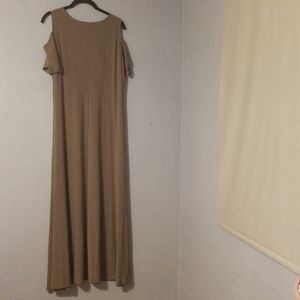 This dress is 56 inches long. The sleeves are off shoulders. The color is a lighter brown. The material is stretchy.