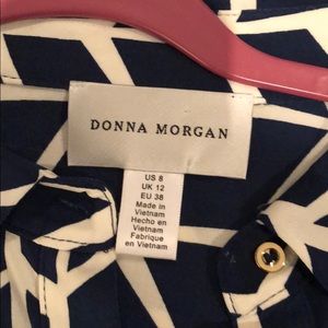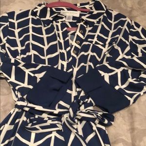 Blue and cream patterned dress with v buttons up the front. Tie around waist. Perfect sleeve length