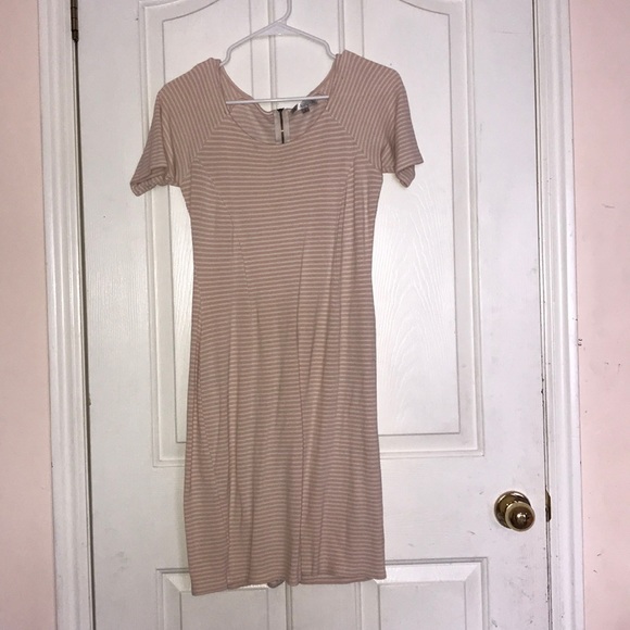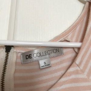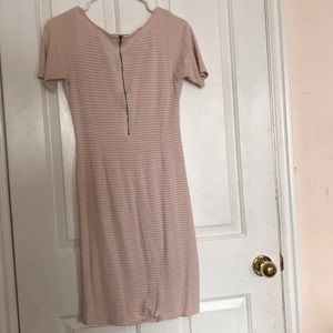 It’s a light pink and white striped dress, with a zipper in the back.