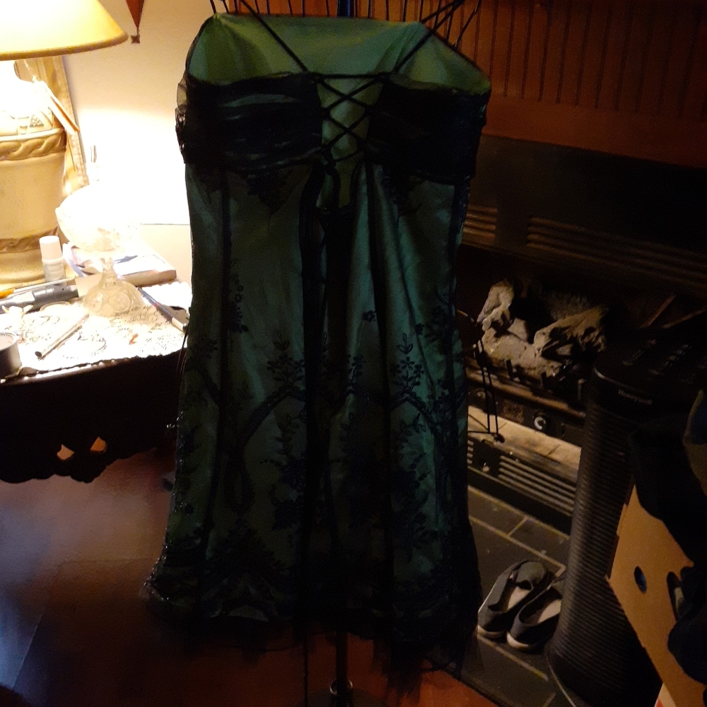Beautiful Greenwich black design on it with black lace on botton.good prom dress it also has a corset back.