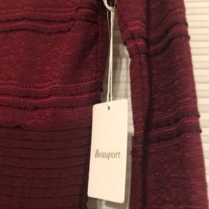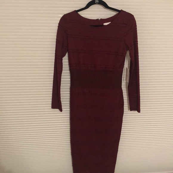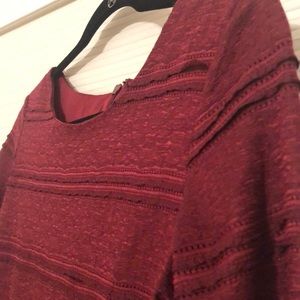 Beautiful dark red/burgundy dress, NEVER WORN! Long sleeve, scoop neck, falls below the knee, form fitting. Has lovely detail throughout especially at the waist for a slimming effect.