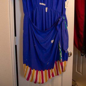 Faux wrap around dress with geometric shape and bright pink,yellow, white pattern and green ribbon design.