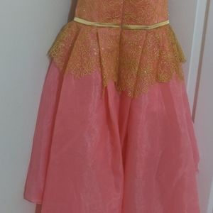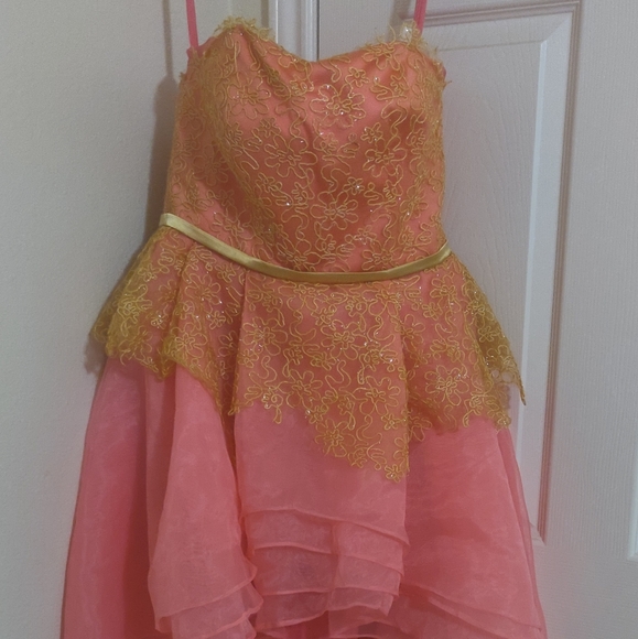 Formal evening wear. Strapless, gold lace at chest, high-low dress