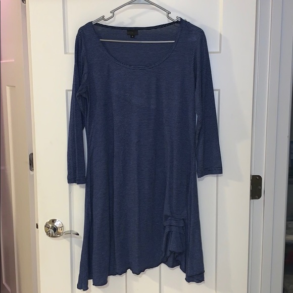 A black and blue elbow length sleeve striped dress with a ruffle at the bottom.