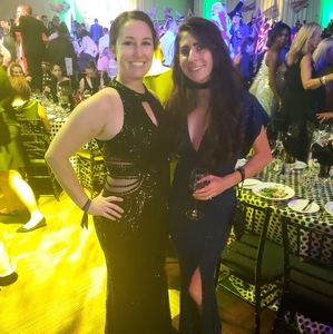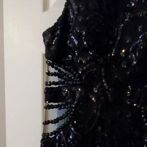 Black ballgown, worn once for a gala. Floor length, zips in back, has cut outs on the sides and opening in front, runs small.