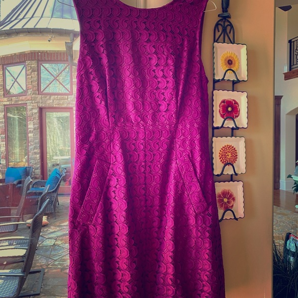 Beautiful magenta dress with lace overlay. Perfect for any occasion, day or night. Gold zipper runs length of entire back of the dress. Pockets make this dress even more comfortable.