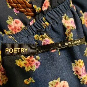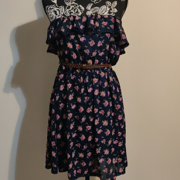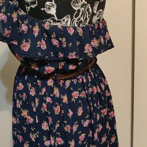 Navy blue dress with floral pink flowers print with a brown braided belt