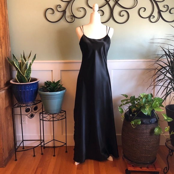 Long black dress, reversible, with spaghetti straps. Polyester satan look on one side, reverses to chiffon look on the other side.