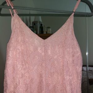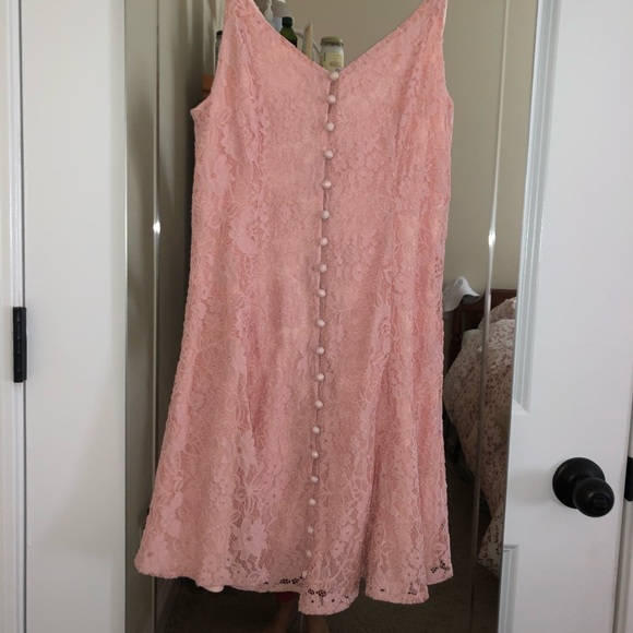 Pink with real buttons all the way down. Adjustable straps and lace. Never worn and is in excellent condition.