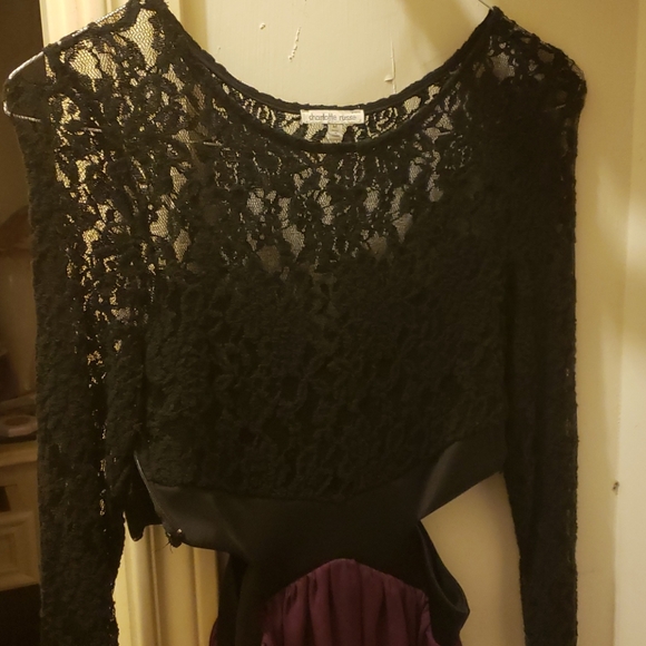 Black see through top with camisole underneath top with a maroon skirt and cut outs on the side