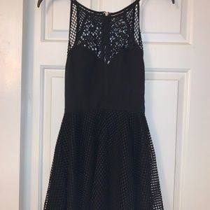 Black dress with grid patterning and texture! Lace/floral neckline and mesh back! perfect for homecoming or a night out! (Euro size 6– US 0)