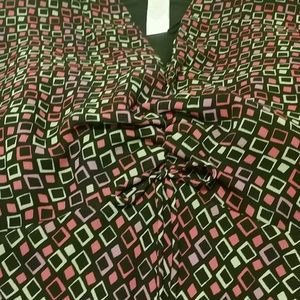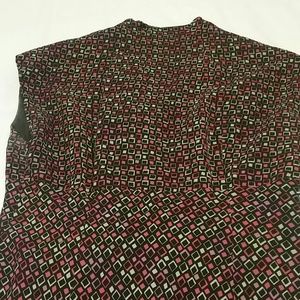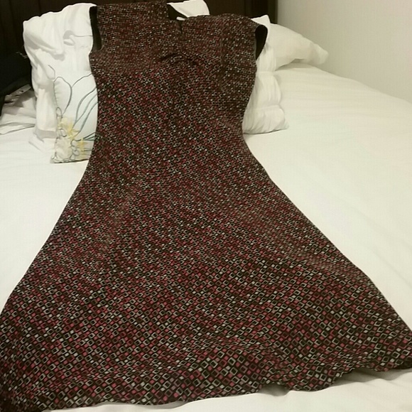 Multi-colored dress. Has sinched front with small statuonary bow. 100% Acetate with polyester lining.