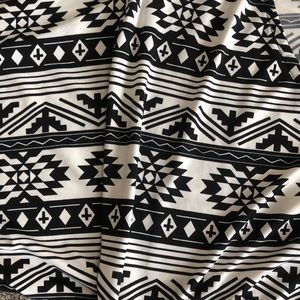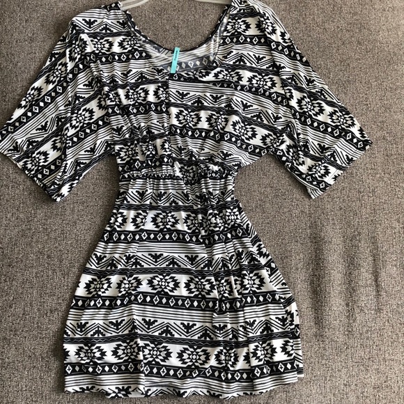 Black and white pattern dress. Fitted at the waist, flowy. Loose sleeves. Stretchy material.