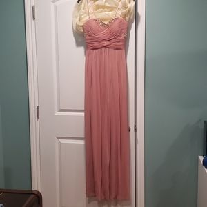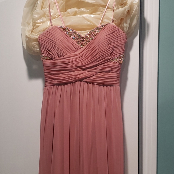 Dusty rose dress, worn once as a bridesmaids dress. Unknown brand. Size was altered to fit, I was a true 0 at the time. Shows some wear at the very bottom.