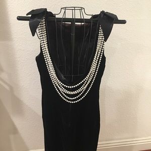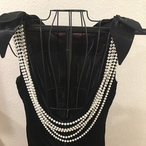 High neckline in the front for class and style only to hit them with a low cut back with your very own back jewelry. Five strands of costume pearls dawn your beautiful back as they watch you walk away.