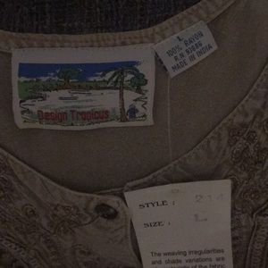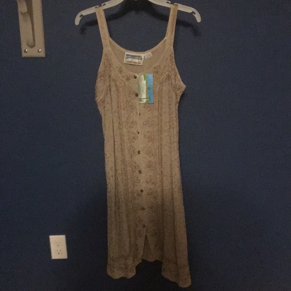 Tan, button up dress with boho look and ties in the back for extra/less form fit