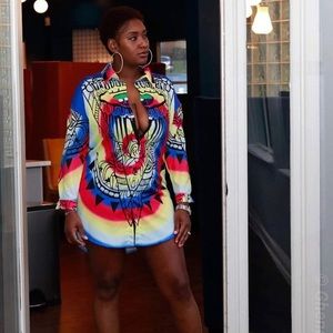 Vibrant multicolor button up dress. Model is 5’4” 164lbs. wearing a size large.