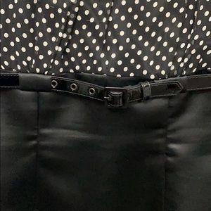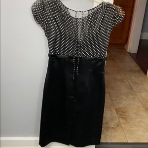 Beautiful , unique formal short sleeve black cocktail dress above the knee. Top portion shear black with white polka dots, with a beautiful black patent leather belt. Dress up for special events/occasions. Size 2P, top shell 100% silk, top lining 95% polyester, 5% spandex. Skirt shell 100% polyester, skirt lining 100% acetate. In good condition.
