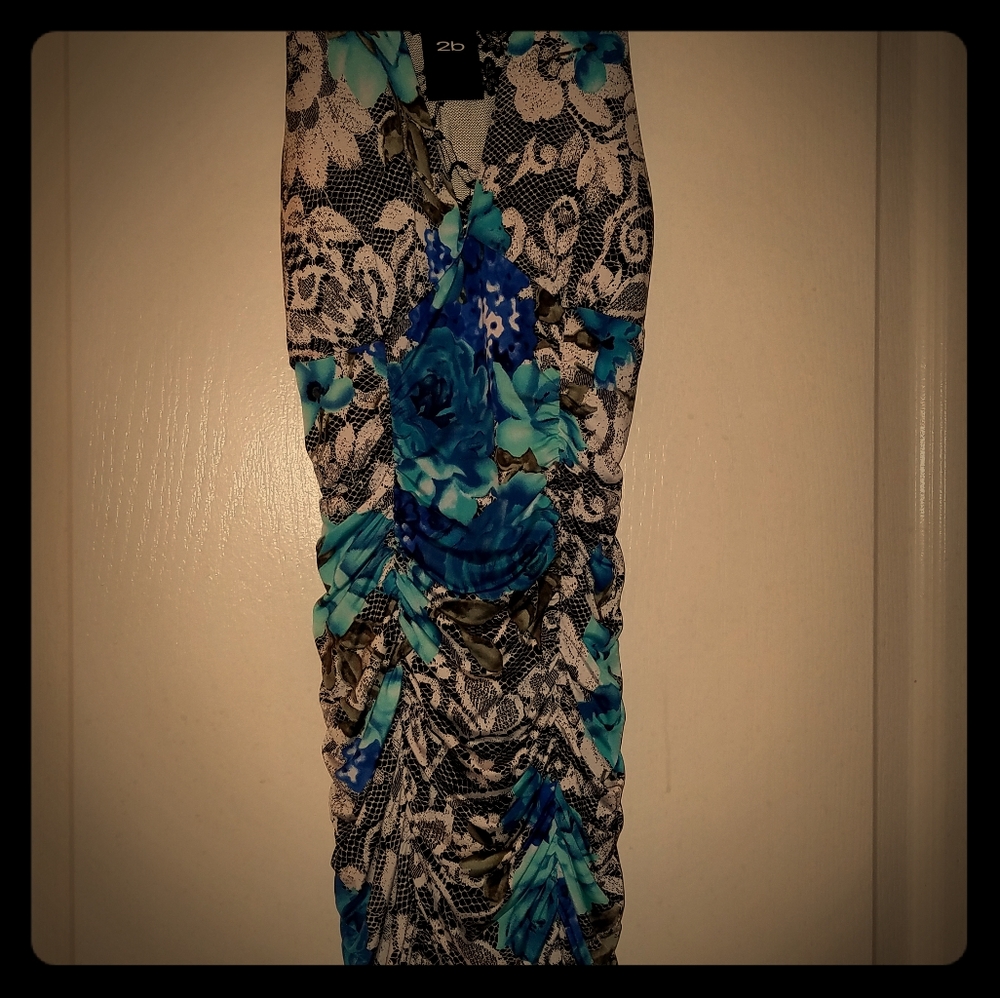 Bebe stretch. drop back with lace background has gathers so, very forgiving and sexy little dress.